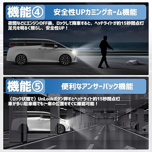 【便利性向上のアンサーバック機能】ロック状態でアンロックを押すとヘッドライトが約15秒間点灯。夜間の車が多い駐車場やショッピングモールでも、車の位置をすぐに確認可能!ひと目で自車の位置を把握でき、探す手間を大幅に軽減します。