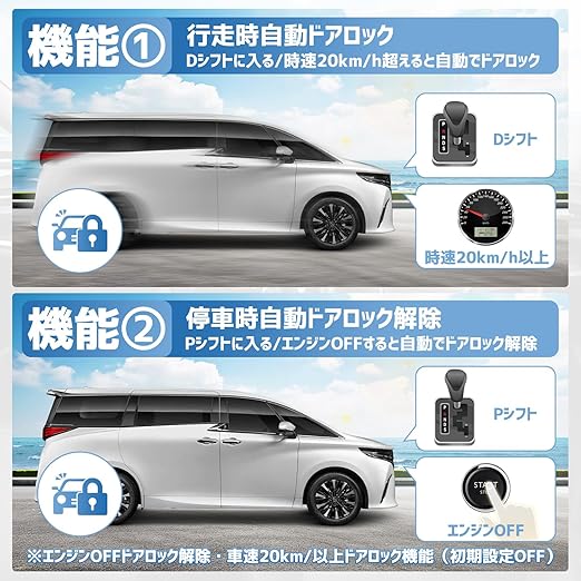 【オートドアロック/車速 シフト連動】Kotesotoの多機能ハーネスは、「D」レンジに入れる、または時速20km/hを超えると自動で全ドアをロックし、走行中の不意なドア開閉やお子様の誤操作を防止できます。PレンジやエンジンOFF時には自動解除され、スムーズな乗り降りを実現します。安全性と利便性を両立した多機能キットです。