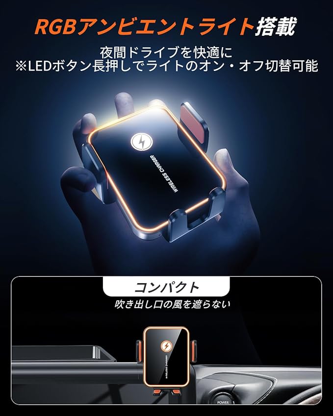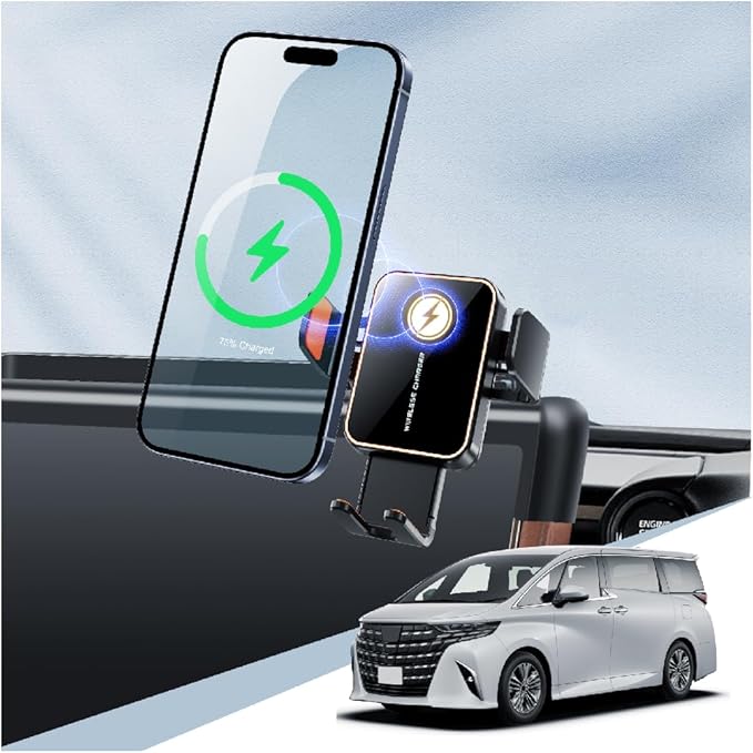 【自動開閉&多色LEDライト搭載】ヴェルファイア 40系ワイヤレス充電 スマホホルダー 背面のタッチセンサー式ボタンを軽く触れると、アームが自動で開閉。片手で簡単に着脱でき、運転中でもスムーズに操作可能です。また、スマホホルダーには変化するLEDアンビエントライトを搭載し、夜間でも視認性抜群。車内をスタイリッシュに彩り、上質な雰囲気を演出します。