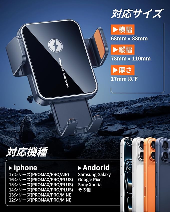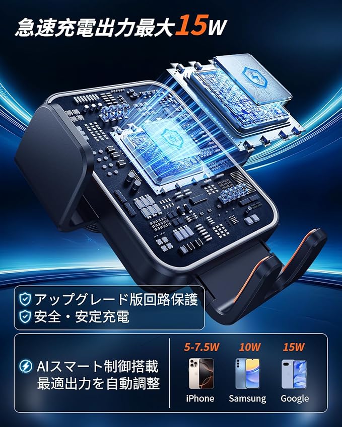 【Qi規格に対応・最大15W】国際標準のQi規格に対応し、スマートフォンを置くだけで自動的に充電が開始されます。最大15Wの高出力で、従来品よりもスピーディーかつ安定した充電が可能。 過電流保護・過電圧保護・短絡保護などの安全機能を搭載し、長時間の使用でも安心です。iPhone12以降のシリーズ、Samsung Galaxy、Sony XperiaなどQi対応スマートフォンに幅広く対応します。