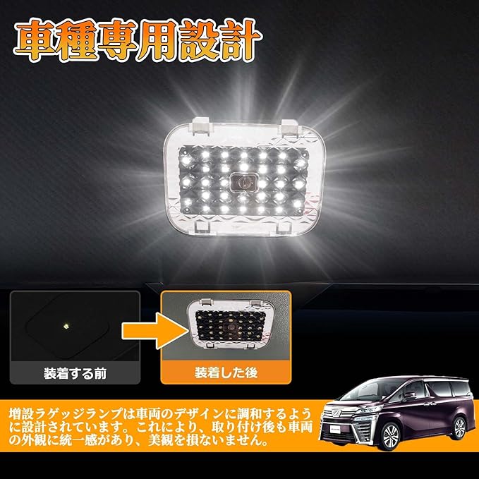 【適合車種】トヨタ アルファード ヴェルファイア 40系。年式:2023年6月~現行;型式:AGH40W AGH45W型。セット内容:アルファード40系 増設ラゲッジランプ 1。※年式/グレード/オプション等により適合しない場合が御座います、ご確認の上お買い求めください。
