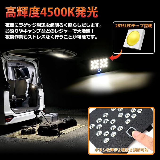 【高輝度&3段階明るさ調整可能】本LEDラゲッジランプは超高輝度のLEDチップが搭載し、広範囲を明るく照らし、荷室オープン時の夜間視認性を大幅に向上します!3段階明るさ調整でき、ボタンを一回押すと明るさが調節可能です。お釣りやキャンプ、夜間作業などに合わせて、簡単に最適な光量に調節することができます。