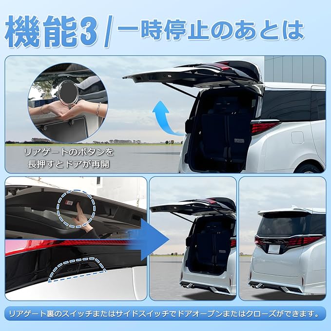 3.【簡単操作】▲自動オープン:リアゲートのボタンを1回押すとバックドアが自動的にオープンします。▲自動クローズ:リアゲートの裏のスイッチを長押しすると自動的にクローズします。▲一時停止:リアゲートのボタン/サイドボタン/リアゲート裏のスイッチを押すと、オープンの途中でリアゲートが一時停止することができます。▲一時停止の後は:①リアゲートのボタンを再び押すとドアが再開します。②リアゲート裏のスイッチまたはサイドスイッチでドアオープンまたはクローズができます。