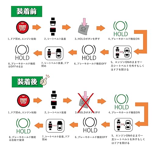 ブレーキホールドオート化キットを取り付けると、エンジン始動する度にHOLDボタンを一々押す必要がなくなり、ブレーキホールド機能は常時ONになります。たまにブレーキホールドを使用したくない場合にはボタンを押すことで簡単にブレーキホールド機能をOFF出来ます。