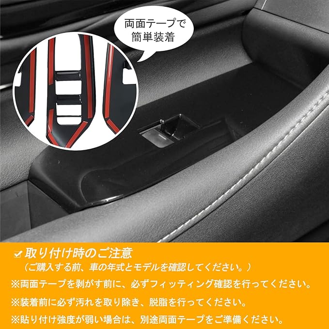 【取り付け簡単】車種専用設計のためフィット感良好。 裏面付属の専用両面テープで簡単に貼り付けできます。貼り付ける前に必ず仮合わせを行い、貼り付け位置を確認してください。