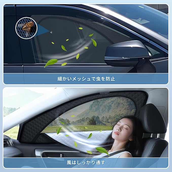 2.【2in1一体式・夏の暑さ・日差し対策に】:遮光と通風を両立した2in1一体式設計。 炎天下で長時間駐車する場合でも、直射日光をやわらかく遮り、車内温度の上昇を抑制します。 ファスナー開閉により、サンシェードとしてもメッシュカーテンとしても使い分け可能。 強い日差しを防ぎながら風を通すため、夏場の車内休憩や移動時の暑さ対策に最適です。
