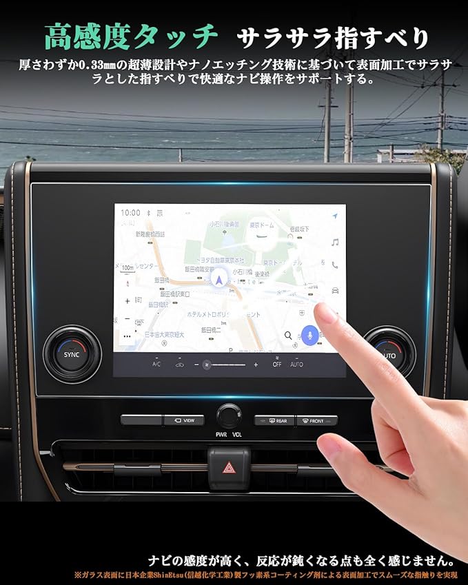 6.【高感度タッチ・サラサラ指すベり】厚さわずか0.33mmの超薄設計やナノエッチング技術に基づいて表面加工でサラサラとした指すベりで感度が高く、快適なナビ操作をサポ一トする アルファード40系アクセサリー です。