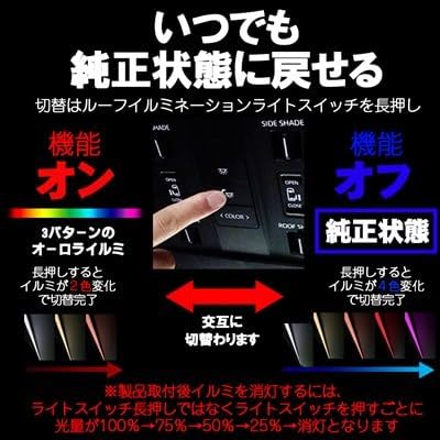 【製品のオンオフの切替】 ・オンへの切り替え ルーフイルミネーションスイッチを3秒以上長押しします、するとイルミの色が2色変化します ・オフへの切り替え ルーフイルミネーションスイッチを3秒以上長押しします、するとイルミの色が4色変化します ※点灯モードに関係なくルーフイルミネーションスイッチを押すごとに100%の光量から75%→50%→25%→消灯となります、長押しでは消灯にはなりません ◎取り付け簡単で、リア天井のコントロールパネルを外してカプラーオンでポンつけできます!