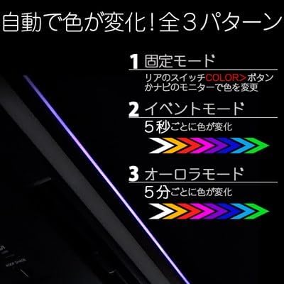 ■切替方法 【モード切替】 ・固定モードへの切り替え リアのスイッチ”COLOR>”を3秒以上流しするとイルミの色が1色変化します ・イベントモードへの切り替え リアのスイッチ”COLOR>”を3秒以上流しするとイルミの色が2色変化します ・オーロラモードへの切り替え リアのスイッチ”COLOR>”を3秒以上流しするとイルミの色が3色変化します