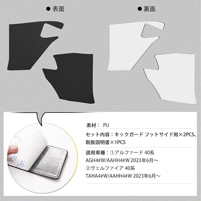 1.【適合車種】①トヨタ アルファード ALPHARD 40系;型式:AGH4#W/AAHH4#W;年式:2023年6月~現行;②トヨタ ヴェルファイア VELLFIRE 40系;型式:TAHA4#W/AAHH4#W;年式:2023年6月~現行;セット内容:キックガード フットサイド用 2PCS、取扱説明書 1PCS;カラー:ブラック;※ご注意:年式・グレード・オプションにより適合しない場合がございます、形状をご確認いただいたうえ、お買い求めください。