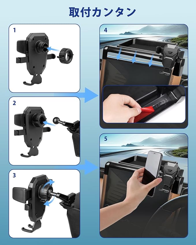 4.【360度回転】:スマホ本体を固定するボールジョイントは360度回転できますので、横向きでも、縦向きでも利用でき、良い視聴体験を提供します。【取付簡単】:本製品をご愛車のナビの上から下まで挿しんでしまいます。初心者でも装着できます。