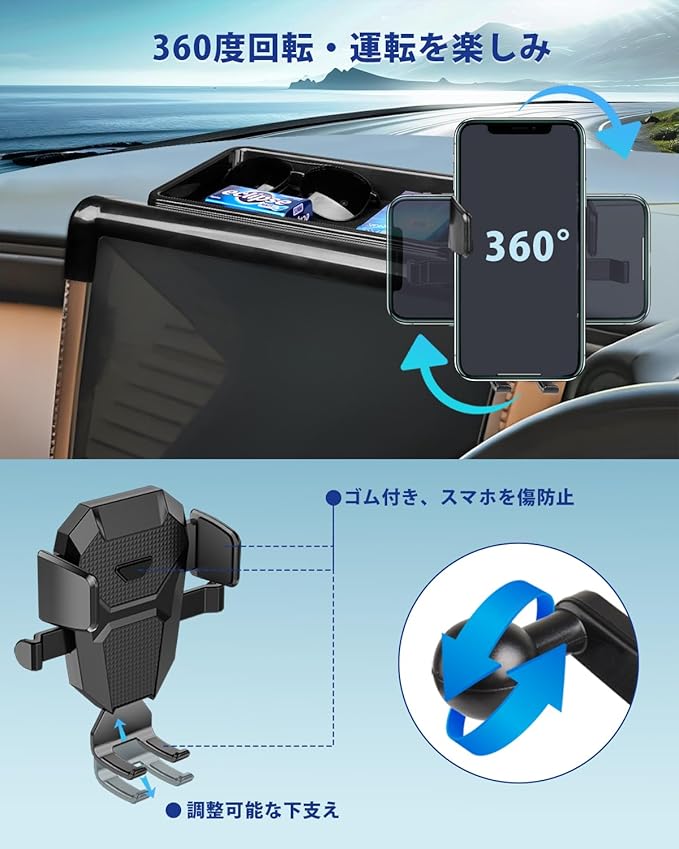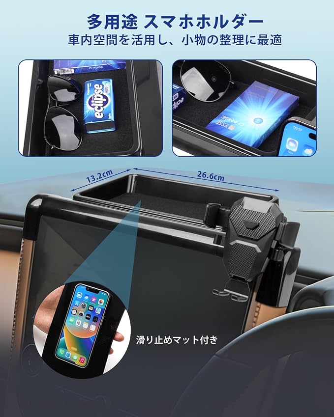 3.【新設計スマホベース】:従来品より、ダッシュボード吸盤タイプは、吸盤が弱くて、落っこちてしやすいし、クリップタイプは、耐荷重が弱く壊れやすく、車内の純正装備を破壊するかもしれません。その問題を解決するように、弊社はナビに設置できる車種専用スマホベースを開発し、お客様に良いドライブ体験を提供できます。それだけでなく、そのベースにはマットが付いているので、滑り落ちにくいです。収納功能もあり、小物を収納出来ます。【抜群な固定性】:車種専用ですので、でこぼこ道でも、揺れたり、落ちたりすることがありません。運転安全性も大いにアップできます。