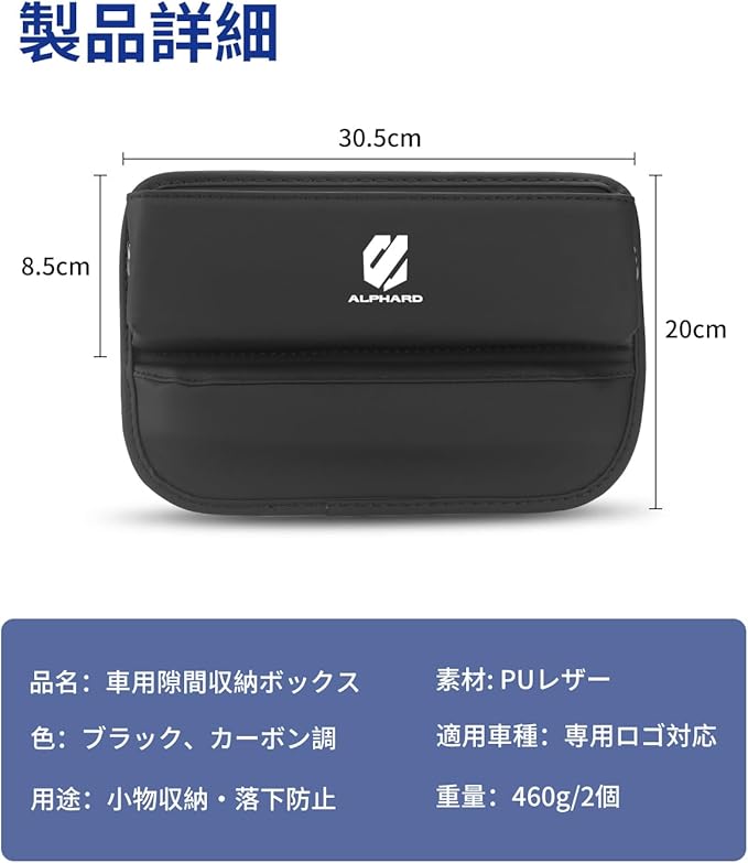 【専用ロゴ付き・高級感溢れ】この隙間収納ボックスは ALPHARD 専用ロゴとおしゃれなデザインでご愛車の内装に合わせやすい、高級感あふれる雰囲気を仕上げります。この隙間収納ケースのカラーはブラック・カーボン調の2色でご用意します。お好みに合わせて自由にお選びいただくことができます。【適用車種】ALPHARD アルファード 20系 30系 40系に適用します。