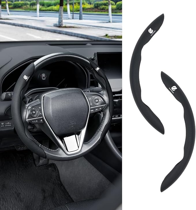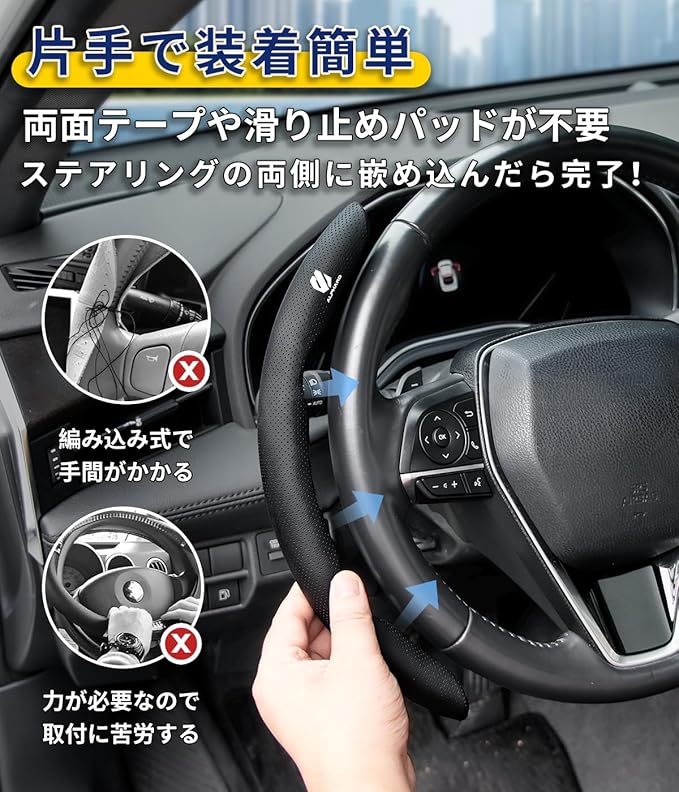 【取付簡単・ズレなし】この ハンドル保護カバー は両面テープや滑り止めパッドが不要で、ステアリングホイールの両側にカチッと嵌め込むだけで取り付け完了です。更に、本製品は現在のサイズとデザインが仕上げるまでに多くの実験を経ました。そのため、ほとんどの車種のハンドルにフィットするだけでなく、ステアリングホイールにしっかりと固定でき、ずれたり外れたりしません。