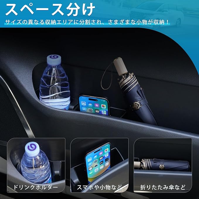 4.【スペース分け】:ドアポケットはサイズの異なる収納エリアに分割され、飲み物、鍵だけでなく、さまざまな小物の収納にも使える。
