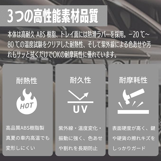 【高耐熱ABS+防滑ラバー】−20~80℃耐熱・UV&振動耐性で色あせ・割れを防止。ラバーライナーが滑りと傷を防ぐ