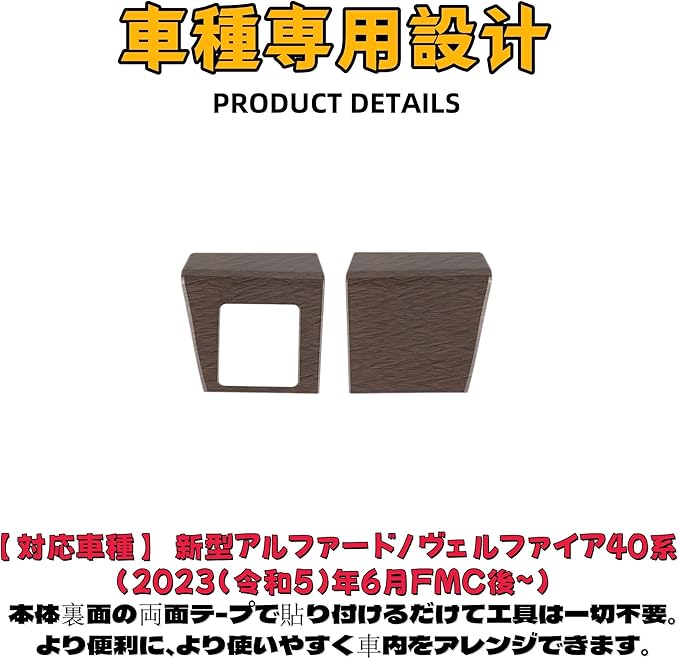 本品は、2023年6月以降に生産されたアルファード ヴェルファイア 40系専用に設計された商品です。環境に優しいABS素材を使用し、安全で無毒、耐熱性・耐寒性に優れ、防水・絶縁性も備えており、長期間ご使用いただけます。実車のデータに基づいて設計されているため、元のカップホルダーに完璧にフィットし、既存の機能を妨げることなく、車内の質感を向上させます。取り付けは簡単で、工具不要で、取り付け面を清掃し、裏面の両面テープを剥がすだけでしっかり固定可能。シンプルで洗練されたデザインと高品質な仕上げが高級感を演出し、車内のインテリアと調和して、車全体の格調を高めます。