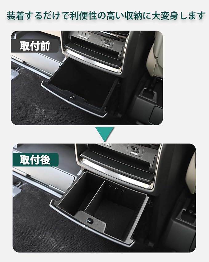【40系乗りには必需品】コンソールリヤエンドボックス内部に仕切りがないため、物を探しにくく、中身が乱れて、充電ケーブルが絡まることは非常に不便ですね。弊社のアルファード/ヴェルファイア 40系専用設計リアマルチボックスを装着するだけで、収納する小物のサイズに合わせて、付属のバリエーションで収納部を仕切ることができます。汚れたら取り外して洗えるので、ゴミ袋をセットしてゴミ箱としても使えます。