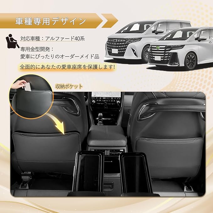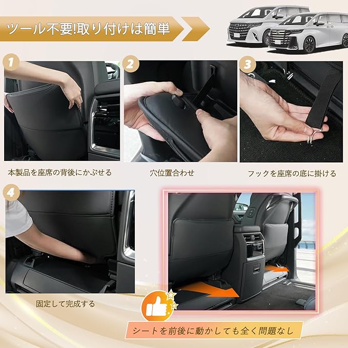 【アルファード専用デザイン、座席の曲線にぴったりフィットすることで摩耗防止!】 トヨタ新型車種アルファードの座席後部のサイズにより作成し、原車の曲線に完璧に適合します。キックしやすいエリアを全面的にカバーすることで、後部乗客(子供/ペット)のキックによる傷、汚れの残りを効果的に防止できます。愛車を永遠に綺麗に保つことができます。【適合車種】①トヨタ アルファード ALPHARD 40系;型式:AGH4#W/AAHH4#W;年式:2023年6月~現行;②ヴェルファイア VELLFIRE 40系;型式:TAHA4#W/AAHH4#W;年式:2023年6月~現行