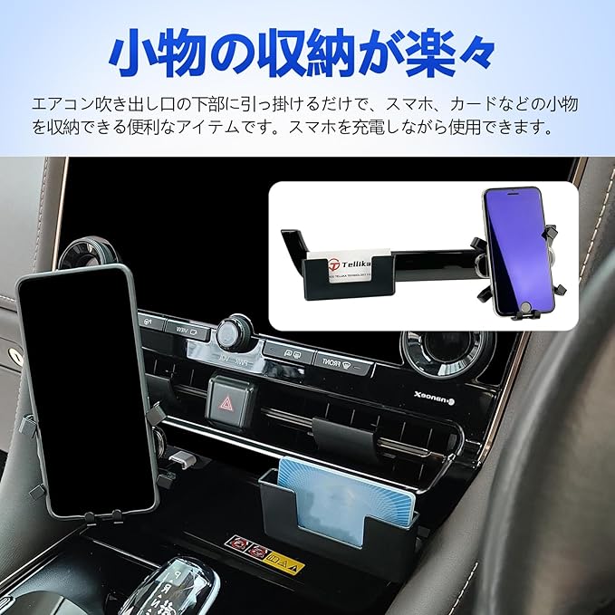 【小物の収納が楽々】エアコン吹き出し口の下部に引っ掛けるだけで、スマホ、カードなどの小物を収納できる便利なアイテムです。スマホを充電しながら使用できます。