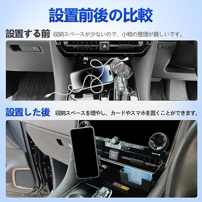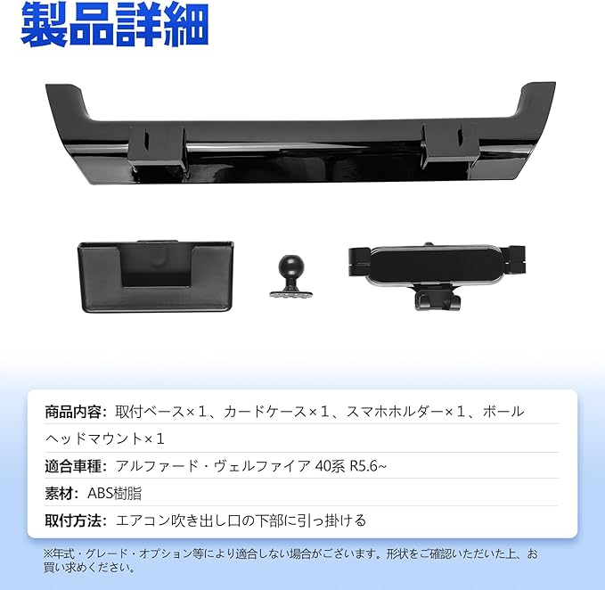 アルファード40系 センター エアコン吹き出し収納ケース ヴェルファイア40系 センターコンソルトレイ ALPHARD VELLFIRE コンソールトレイ ABS素材 簡単取付 小物収納 内装 整理 便利パーツ アクセサリー インテリア ドレスアップ カスタム パーツ(固定ベース+スマホホルダー+カードケース)
