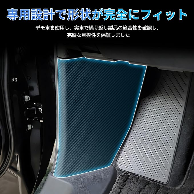 乗降時の擦り傷や汚れをしっかり防止。高耐久PVCレザーと3Dカーボン調デザインを採用し、耐摩耗・防水でお手入れ簡単。