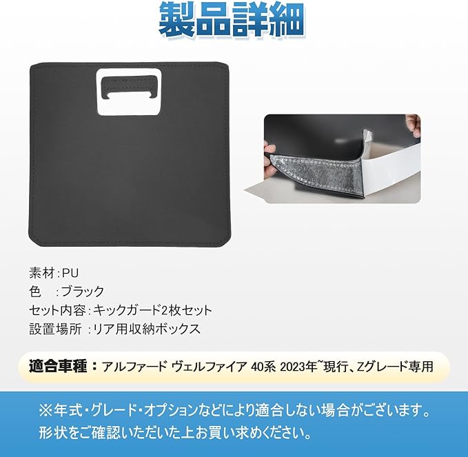 【適合車種】アルファード ヴェルファイア 40系 Zグレード専用、2023年~現行。※この製品はZグレードのみ適合いたします。Excective Loungeは適合対象外なので、ご注意くださいませ。Excective Loungeの持ち主は本製品のご購入をご遠慮ください。セット内容:キックガード2枚セット、設置場所:リア用収納ボックス。色:ブラック。丸めて梱包しておりますので、多少シワが付いております。シワに関しては時間が経過すると解消します。気になる方はご注意くださいませ。