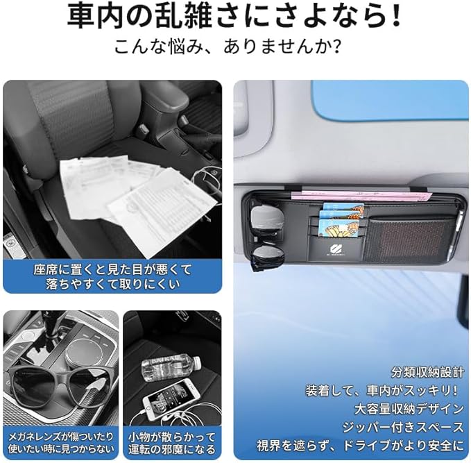 【多機能収納】このカーサンバイザーの収納ポケットは、メガネやカード、スマホ、ペンなどをそれぞれ専用のスペースに収納できるように設計されています。身の回りの必需品を整理整頓し、車内をすっきりと保つことができます。