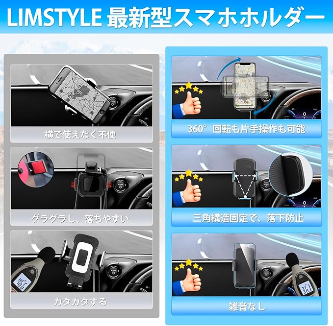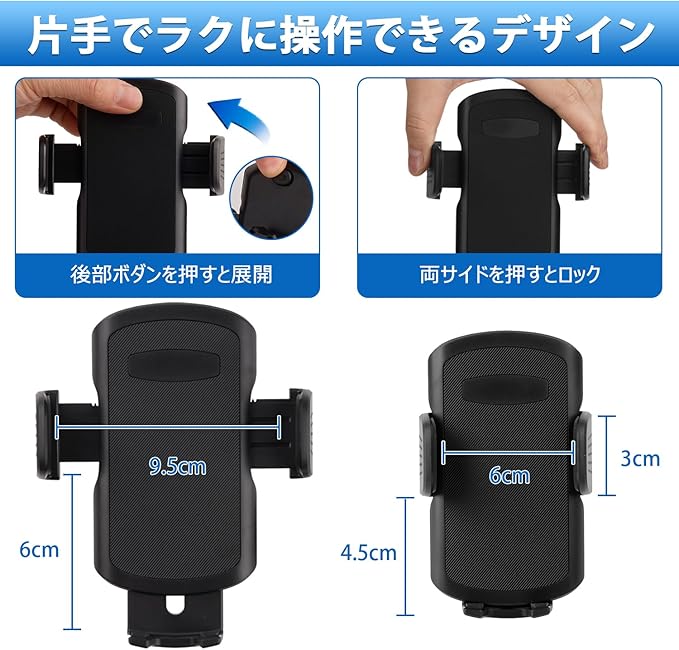 3.【安定感抜群!使いやすい】:スマートフォンをしっかりロックし、揺れても落ちないデザインを採用しています。それに、中心にボタンが配置されており、スマホをホルダーに置けて、軽く押すと自動ロックされるので、とても便利です。さらに、下支えが邪魔せず充電可能です。