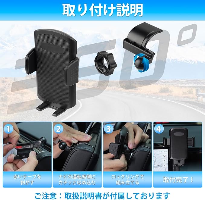 5.【2026年実車確認済み】:本製品はカチッとはめ込むタイプで、現車採寸を何度も施したので極めて高いフィット感を実現します。【取付手順】:①固定ベース底部の(跡が残らない)赤いテープを剝がす。②固定ベースをナビの運転席側にカチッとはめ込む。③ロックリングでスマホホルダーをベースに取付けてから完了。【ご注意】:取扱説明書が付属していますので、取付けの際は説明書に従ってください。