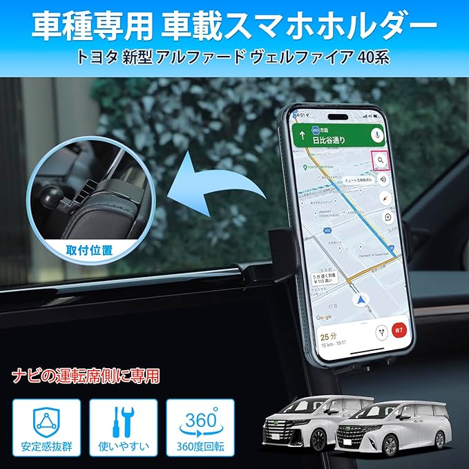 トヨタ 新型 アルファード 40系 スマホホルダー ヴェルファイア 40系 携帯ホルダー ALPHARD VELLFIRE 40 スマホスタンド 携帯スタンド ナビ 運転席側に専用 R5.6~現行 片手操作 360度回転 4.7~6.5インチに対応 内装パーツ アクセサリー 車種専用 装着簡単 メーカー直営
