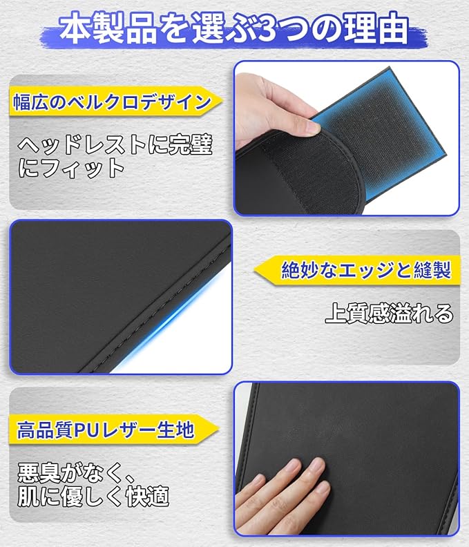 【取り付け・お手入れ簡単】本製品は数秒で簡単取り付け可能なヘッドレストカバーです。ヘッドレストとシートの隙間に通してマジックテープで留めるだけで簡単着脱!運転席、助手席、後部座席(一部分の車種)にお使いいただけます。高級感溢れるの高品質PUレザー製により、汚れや水濡れに強く、お手入れも布で拭くだけで簡単です。