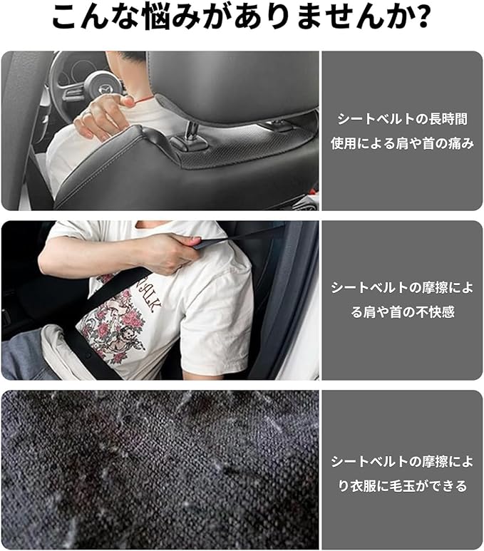 【より快適な運転と乗り心地を】本製品はドライブの際にシートベルトからの首・鎖骨・肩を摩擦する痛みを軽減するシートベルトカバーです。更に、このシートベルトパッド は急ブレーキの衝撃とシートベルトの圧迫感を和らげてくれます。このシートベルトカバーは、長時間ドライブの時に最適なグッズとなり、旅行中の快適さを与えます。
