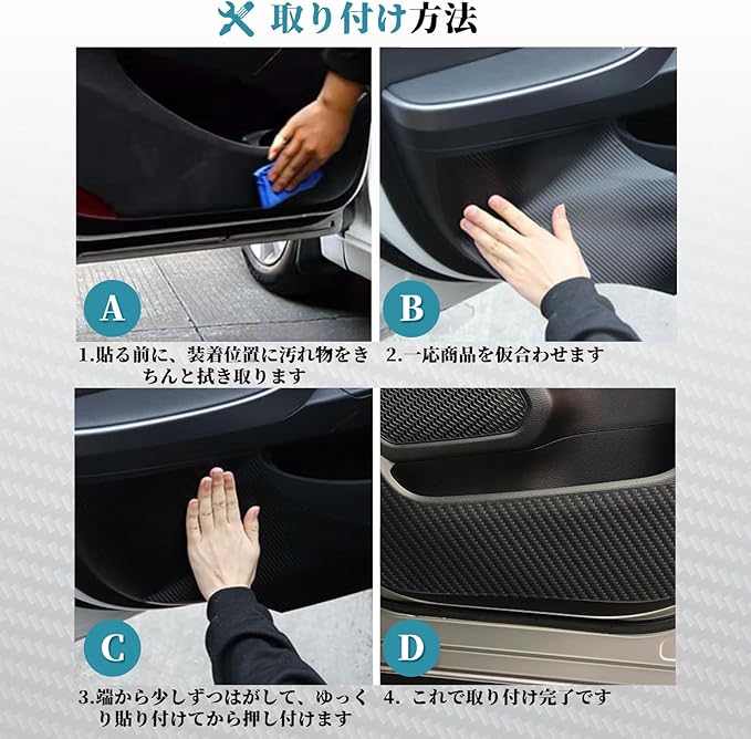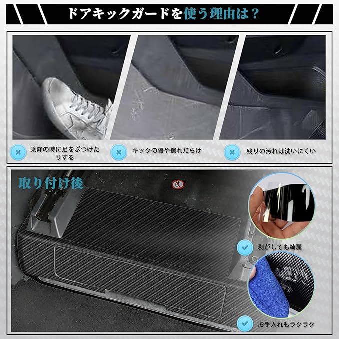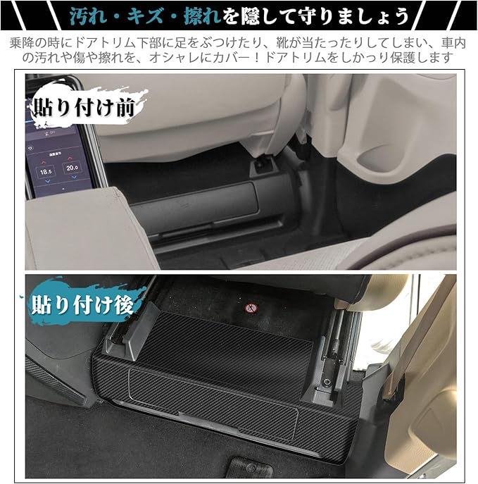 【傷・汚れ防止・保護】:乗降の時にドアトリム下部に足をぶつけたり、靴が当たったりしてしまい、車内の汚れや傷や擦れを、オシャレにカバー!フィット感はバッチリで、シートを貼ったようには見えず、最初からのデザインのように見えます。汚しても雑巾で簡単に拭き取り、お手入れもラクラク。シートも既に擦り傷だらけになってしまっても現車損耗なくシートを張り替えればいい楽な作業です。