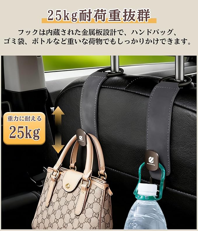 【優れたスエード・耐荷重抜群】このヘッドレストフック表面は優れたスエード採用し、耐摩耗性に優れあり、ほつれや劣化が起きにくく、長期間の使用可能です。また、フックは内蔵された金属板があり、最大25kgの荷重に耐えられる構造で、ハンドバッグ、買い物したビニール袋、帽子や傘などのアイテムをかけにも役立ちます。