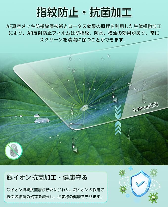 【AF真空メッキ指紋防止】:AF真空メッキ指紋防止技術及びロータス効果の原理を利用した生体模倣加工により、フィルムの表層に防指紋及び疎水撥油の効果を達成させ、画面を清潔で爽やかに保っています。銀イオン抗菌技術を新たに追加することで、細菌の残留を減らし、健康を保護することができます。同時に、フィルムエッジの2.5D曲面加工は、フィルム表面の張力を増加させ、衝撃を軽減し、手を傷つけないです。