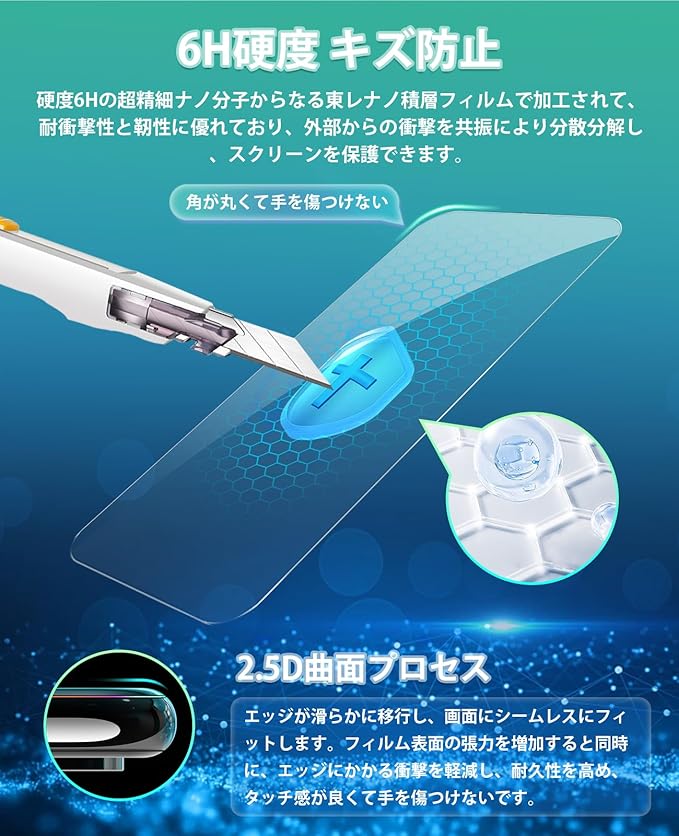 【耐衝撃・傷防止】:極細ナノ分子からなるナノフィルム積層は、高い靭性及び強い緩衝性を有し、物体に与える衝撃を共振により分散させることができ、スクリーンを損傷から保護することができます。また、ナノ反発融合技術は一定時間内にフィルム表面の細かい損傷を修復することができます。