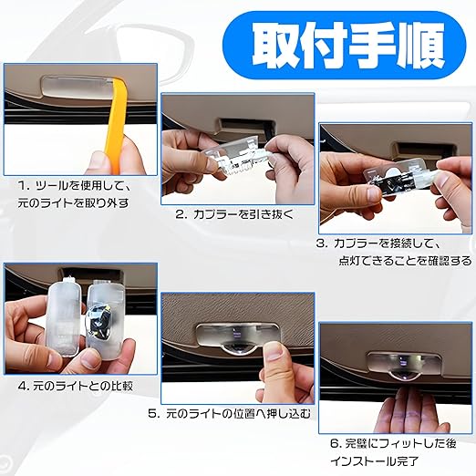 【取付簡単】カーテシランプのカプラーを外し、本製品と差し替えるだけの簡単作業で、穴あき不要、配線加工も不要です!あなたの愛車を傷つけることなく簡単な取り付けでOKです!【商品仕様】電圧:9-12V。色温度:6500k。出力:5W 。材質:難燃性材料。使用温度:40 - +105℃。走行コンピュータ上に誤提示や警告がなく、直接原車部品を交換し、配線や線路を修正する必要がありません。※原車の設定を変更しないで、負荷抵抗を叩いたり、原車の線路を交換しないでください。