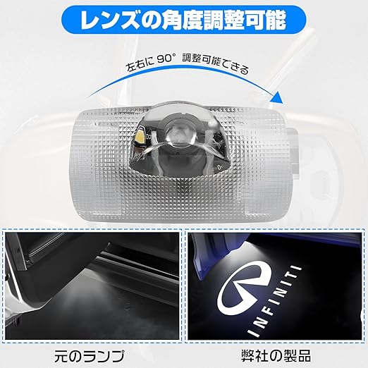【ドアを開ければ、高輝度のLEDの光が地面にロゴと文字を投影!】足元をムーディーに照らし出します。ドレスアップに効果絶大!夜の足元を彩る魅力的なカーテシーランプです!さらに、車内側ランプ(製品側面)の点灯部分も光る仕様に!ロゴと文字が幻想的にLEDが点灯!ブルーは幻想的なブルーが点灯または点滅します!ホワイトは綺麗にカッコよく清らかな白色ライトが足元を照らし出します!さらに機能切り替えで、点滅にもできる!ドアを開けている間は点滅するので、後続車にアピールし安全にも一役買います。