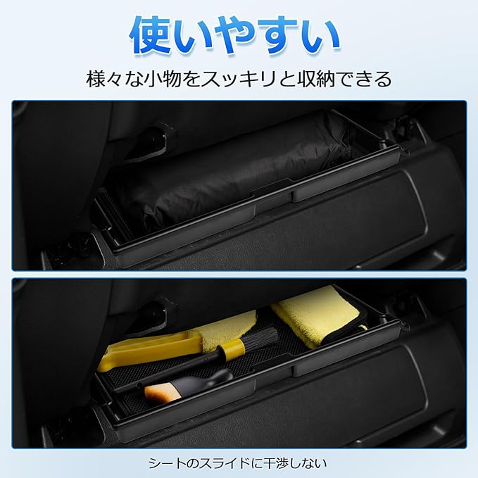 5.簡単取付&水洗い可能:助手席側下の既存の収納ボックスに置くだけでお手軽に装着し、脱着も簡単です。それに、汚れても水洗いをすれば繰り返し使用可能ですので、お手入れも楽々。ご注意:付属の両面テープは補助用で、跡が残りにくい仕様となっております。そのため粘着力は強くありません。しっかり固定されたい場合は、市販の強力両面テープをご使用ください。
