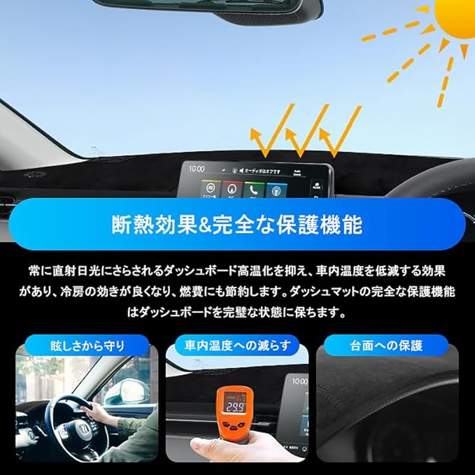 劣化防止と断熱効果:常に照らされ続けるダッシュボードを、マットがガード、ボード本体の劣化ひび割れを防ぎ、エアコン効果もアップ。