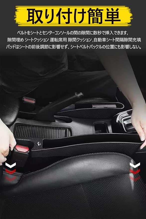 【使い方は簡単】:運転席、助手席のシートベルト口に挟むだけの簡単装着。シートデザインの統一感を損なわずに、シートとセンターコンソールの隙間を埋める。