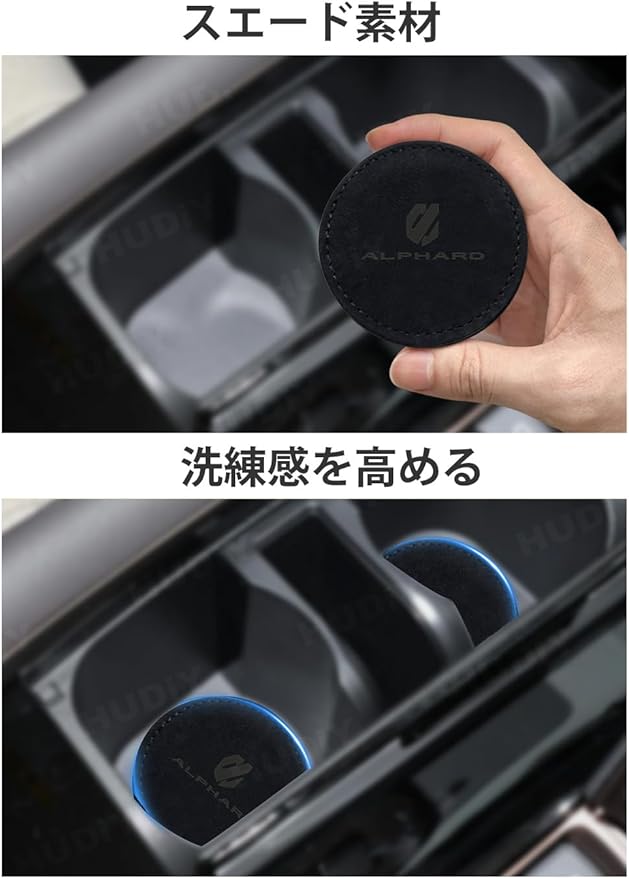 HUDIY(フーディ)アルファード 40系 専用 車載カップコースター 70mm 直径 専用ロゴ印刷 高摩擦ブラックスエード 滑り止め スポンジ三層構造 ブラックステッチ ノンスリップ 防水 防塵 車内インテリア ギフト 2個セット