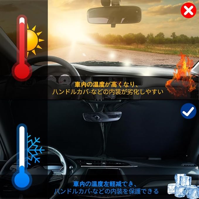 [多目的]:サンシェードはフロントガラスに使用され、多機能の目的を持っています。フロントガラスからの太陽光を効果的に遮り、プライバシーも保護します。停車中は車内の温度上昇を抑え、走行中は眩しさを軽減し、運転の安全性と快適性を向上させます。
