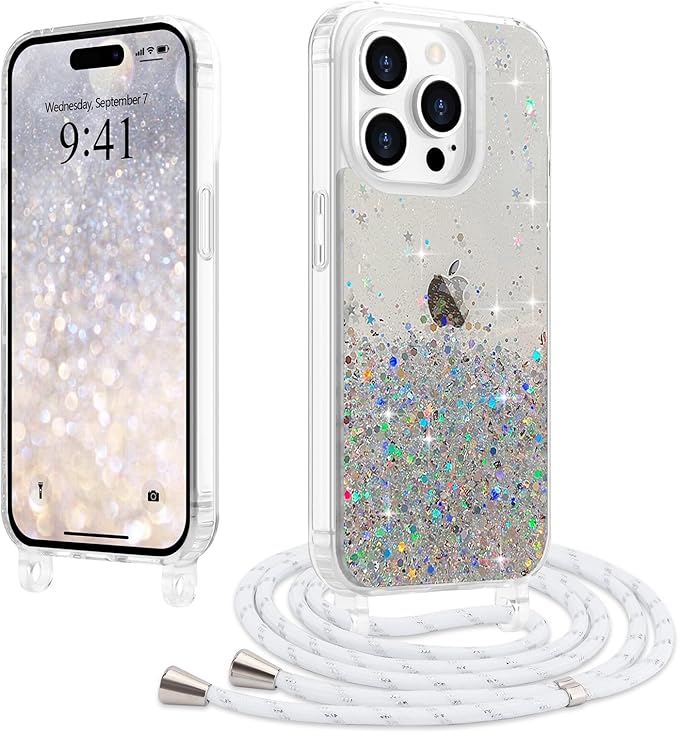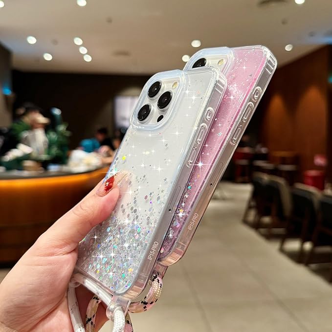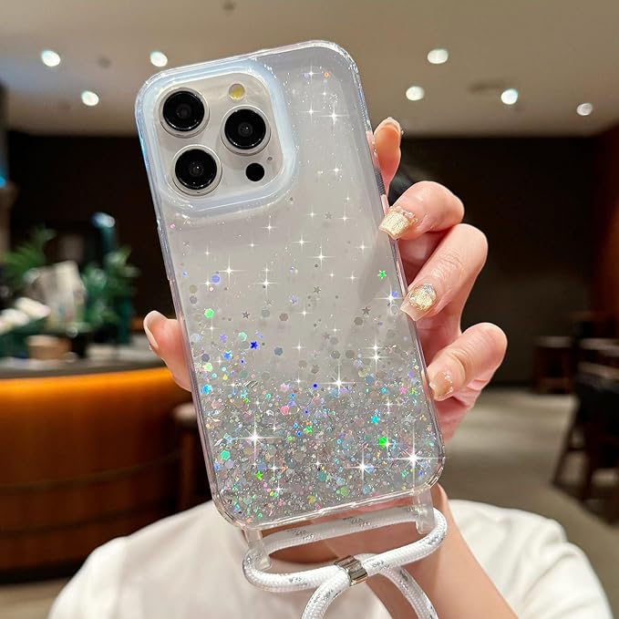 LCHULLE 用の iPhone 15 Pro Max ケース キラキラ ラメ ショルダー ストラップ付き カバー かわいい グリッター 女の子 韓国 おしゃれ 斜めかけ 肩掛け 軽量 耐衝撃 TPU 落下防止 ネックストラップ 長さ調整可能 用の アイフォン 15 Pro Max スマホケース(透明)