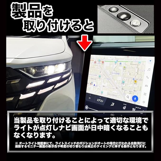 製品を装着する事で、明るさに応じた適切なタイミングでライトが点灯!少しの暗所でナビ画面が暗くなることもありません!