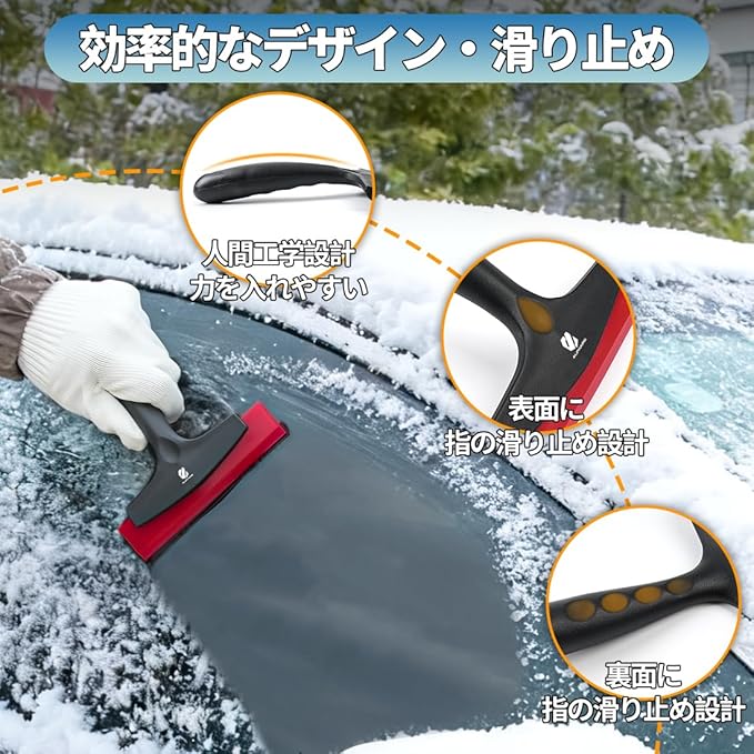 【効率的なデザイン 滑り止め】この車用除雪ブラシは、人間工学に基づいて自然な曲線を持ち、短いハンドルデザインにより、力を入れやすく、腕への負担を軽減します。ハンドルの表面には、指がかかる部分に滑り止め設計が施されており、指をしっかりと密着させることができます。さらに、ハンドルの底部にも指の滑り止め設計が採用されてハンドルが滑るのを防ぎます。
