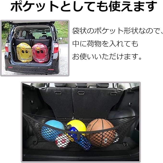 ポケットのようになっているのでネットの中に荷物を収納固定ができます。また仕切りとしても使えるので空間の有効活用におすすめです。