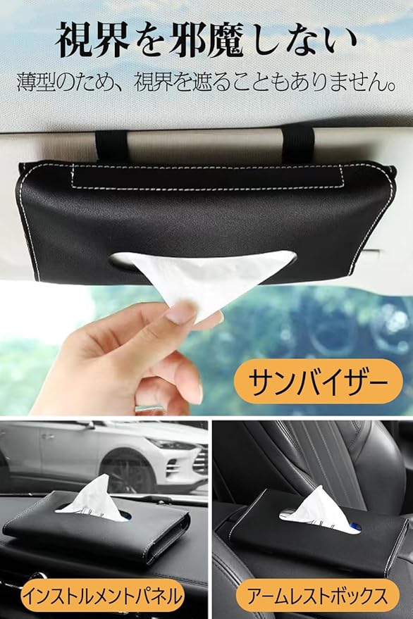 【シートバック+サンバイザー 2点セット】サンバイザー用ティッシュケース:サンバイザーに簡単装着できるティッシュケース。取り出しやすくて目障りにならないので、運転中にはより安心です。シートバック用ティッシュケース:車のヘッドレスト、アームレスト、コンソール、シートサイド、ダッシュボードに取り付けることができ、ティッシュや小物の保管に多機能で便利です。