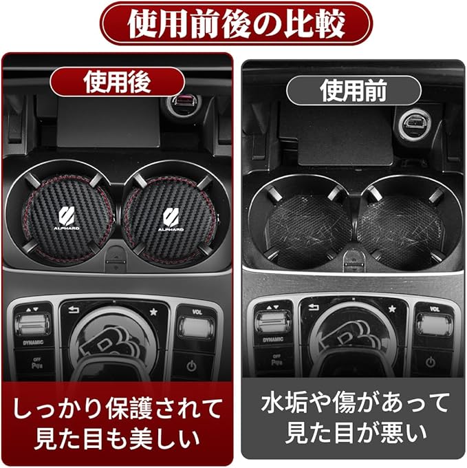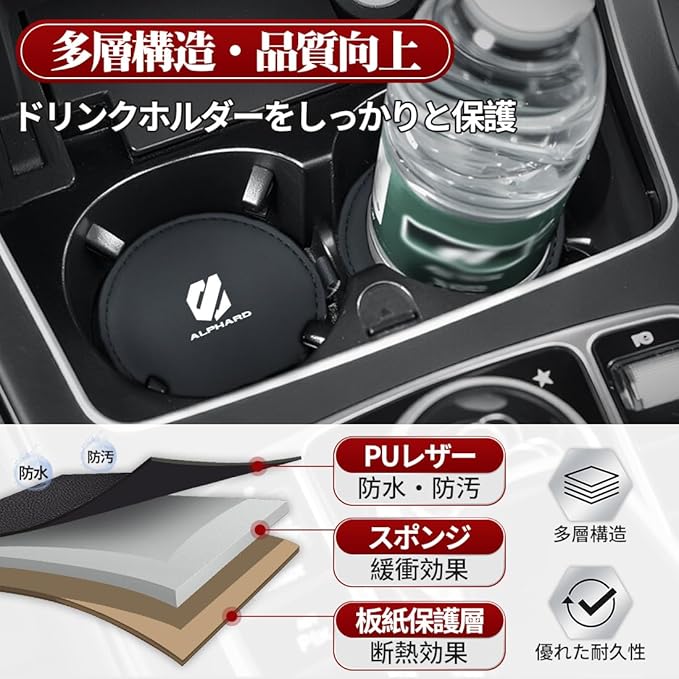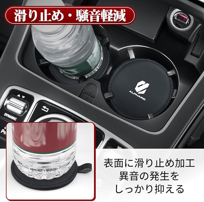 【オシャレな見た目 保護機能付き】このカーコースターは美しい外観を持ち、質感を向上させます。車内の高級感を引き立て、ユニークな雰囲気と品格を加えます。表面はPUレザーで覆われており、ドリンクホルダーの隙間に水分がしみ込むのを防ぎ、水垢や汚れの発生を抑えます。さらに、熱いカップが車の内装に直接触れるのを防ぎ、傷がつくのを防ぎます。ドリンクホルダーをしっかりと保護します。適用車種:アルファード 20系 30系 40系